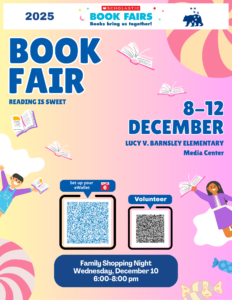 The Barnsley Winter Book Fair – “Reading is Sweet” – will be open in the library during school hours Dec 8 – 12. It will also be open for the Family Night on Wednesday, December 10th. Click here for more information and to set up an e-wallet.