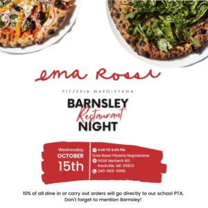 Join us for Barnsley Restaurant Night at Ema Rossi on October 15th! Between 4-8 pm, 10% of all dine in or carry out orders will go directly to our school PTA. Don’t forget to mention Barnsley!